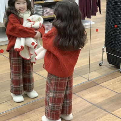 [빠른수입] 레드니트도톰체크바지셋